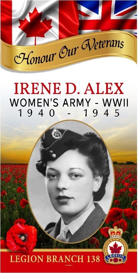 Irene Dorothea Alex enlisted in June 1940 in Liverpool, England, at the age of 16. She served in the Auxiliary Territorial Service as part of the military police, completing her training at Aldershot before being posted to various locations in England.