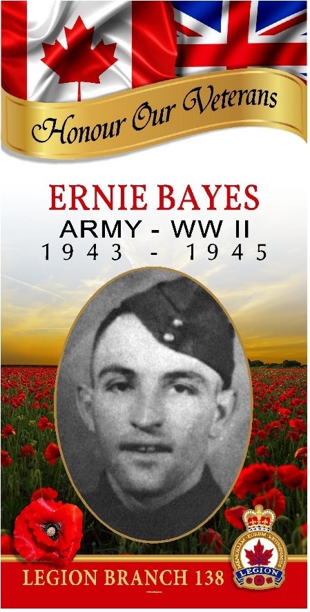 Ernest Frank Bayes enlisted in February 1943 and completed training in Manitoba and Nova Scotia before deploying overseas later that year.