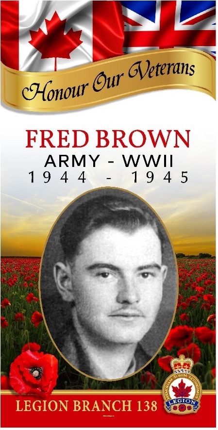 Frederick George Brown enlisted in November 1944 at the age of 18. He completed his training in Winnipeg and Camp Shilo.