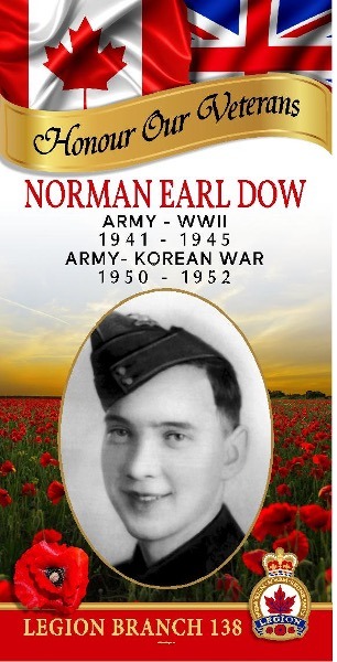Norman Earl Dow enlisted in 1941 at age 17 with the Royal Canadian Artillery. He trained across Canada before deploying overseas in 1942.
