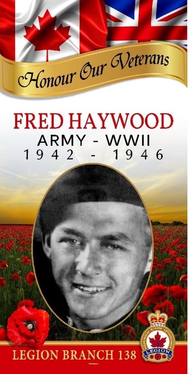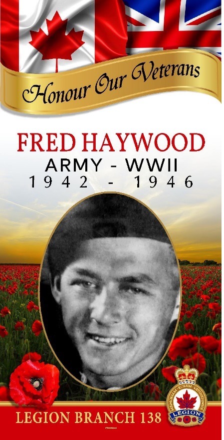 Frederick Russell Haywood enlisted in Brandon on April 2, 1942, at the age of 18. Originally from Glencairn, Manitoba, he completed training in Winnipeg, Portage la Prairie, and Camp Shilo.