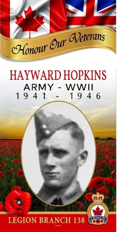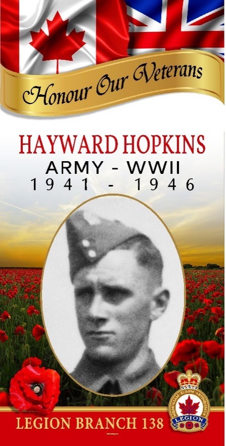 Hayward Charles Hopkins was raised on the family farm near Clanwilliam, Manitoba. He was called for service in May 1941 and later joined the Active Army in May 1942.