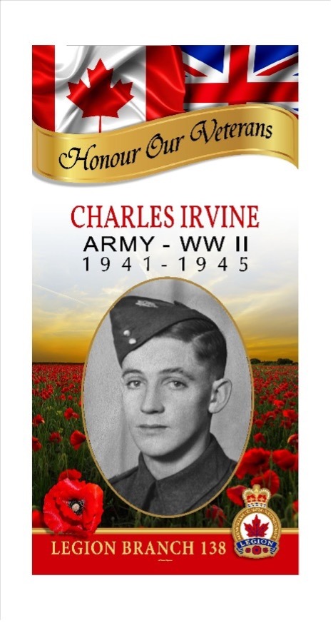 Charles Irvine enlisted in the Royal Canadian Army in 1941 and completed training at Red Deer, Alberta.