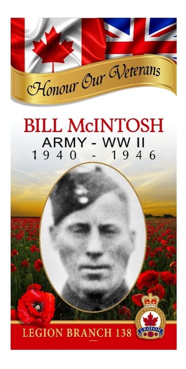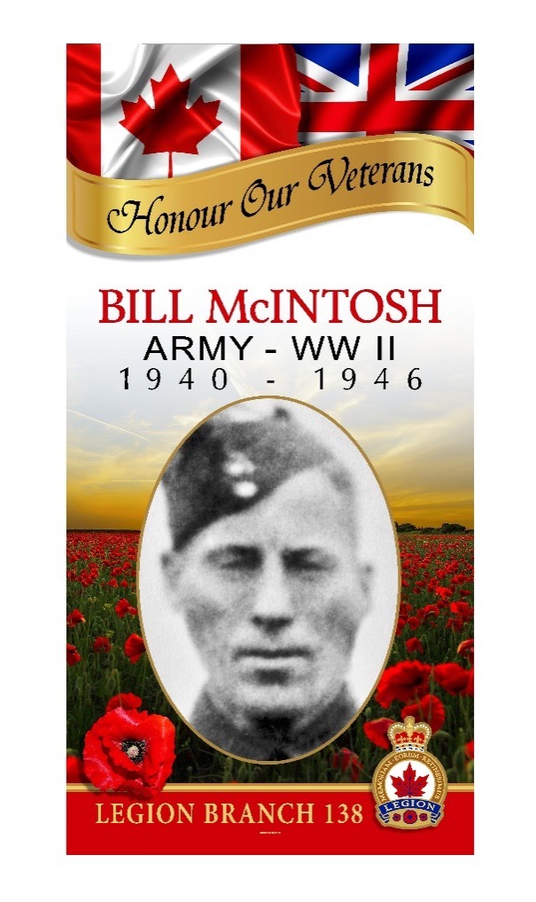 William Neil McIntosh, known as Bill, was born July 1, 1903, the only son of Neil and Annie McIntosh. He was educated in Neepawa, Manitoba, and farmed with his father before continuing to operate the family farm in the Basswood district for seventeen years.