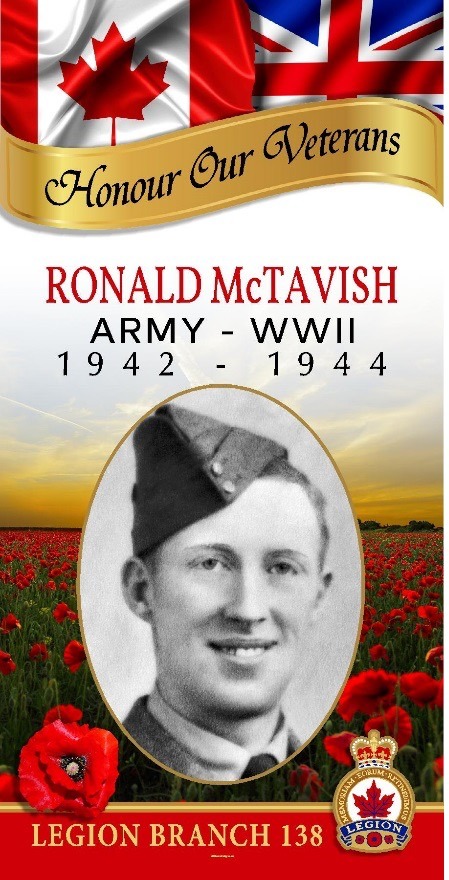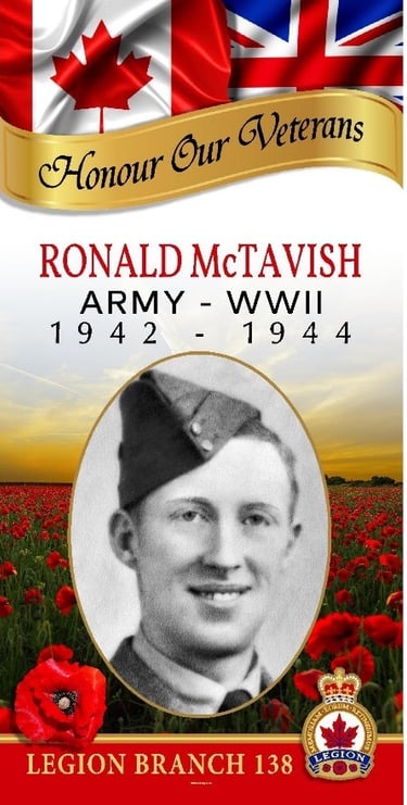 Albert Ronald McTavish enlisted on December 8, 1942, at Fort Osborne Barracks in Winnipeg at the age of 25 while working on the family farm in the Basswood area.