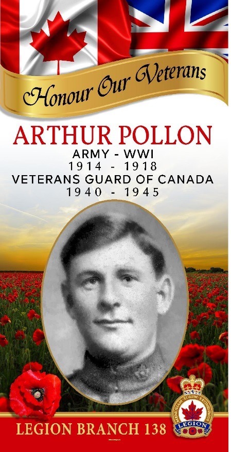 Arthur Roy Pollon was born February 27, 1895, on the family farm in Minto Municipality, Manitoba. He attended Clanwilliam School.