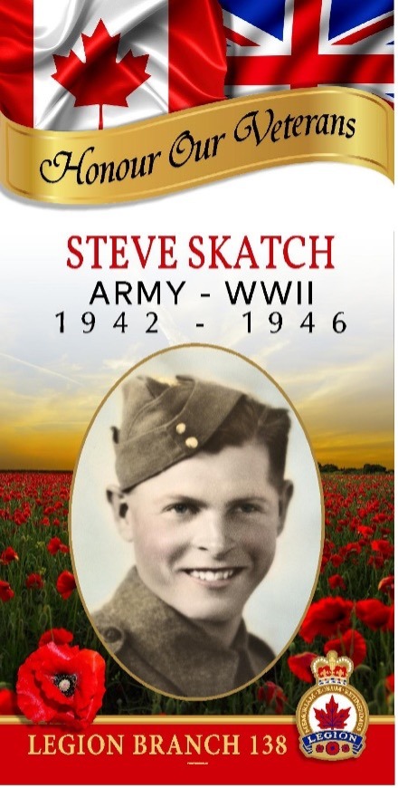 Steven Russell Skatch enlisted in Dauphin, Manitoba, on April 15, 1942, at the age of 19 while working at a sawmill near Moon Lake.