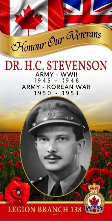Henry Carson “Stevie” Stevenson was born November 3, 1918, in Belmont, Manitoba, the son of Dr. William and Katherine Stevenson. He studied Medicine at the University of Manitoba, financing his education through seasonal work in cheese plants in the Interlake region.