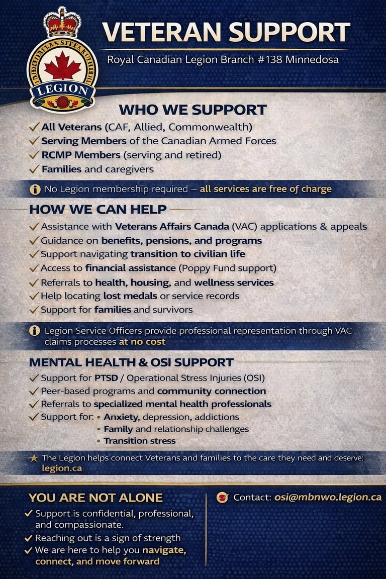 At the Minnedosa Legion Branch #138 Minnedosa, we are committed to ensuring that every Veteran and serving member has access to the support, guidance, and advocacy they deserve.
